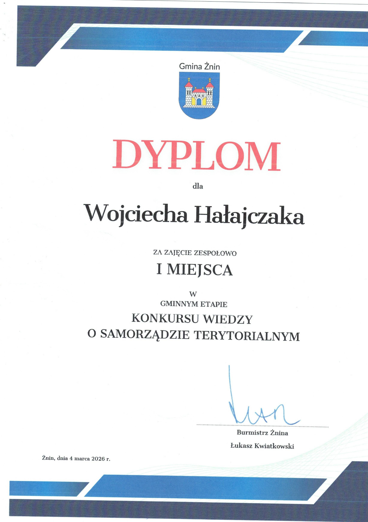 W konkursie tym zespół w składzie: Antonina Zielińska, Wojciech Hałajczak, Jacek Mielczarek, zajął I miejsce i będzie reprezentował Gminę Żnin na etapie powiatowym. GRATULUJEMY!!!
